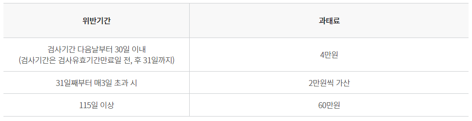 자동차 정기검사 및 종합검사 유효기간 위반 시 60만 원 이하의 과태료 처분을 받을 수 있습니다.