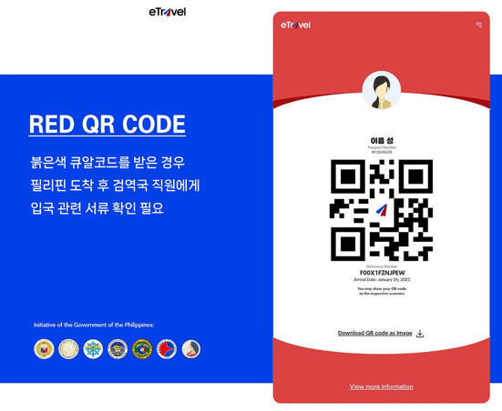 녹색 QR코드의 경우 전용통로를 이용해 빠르게 필리핀으로 입국 가능하며, 붉은색 QR코드의 경우 필리핀 입국 시 검역직원의 확인을 받아야 합니다.