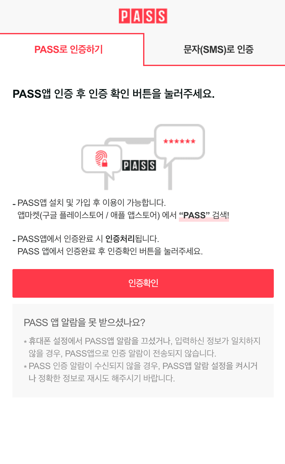 7. PASS 인증 선택 후 [통신사] 선택 후 [전체동의] 체크  후 [PASS로 인증하기] 클릭