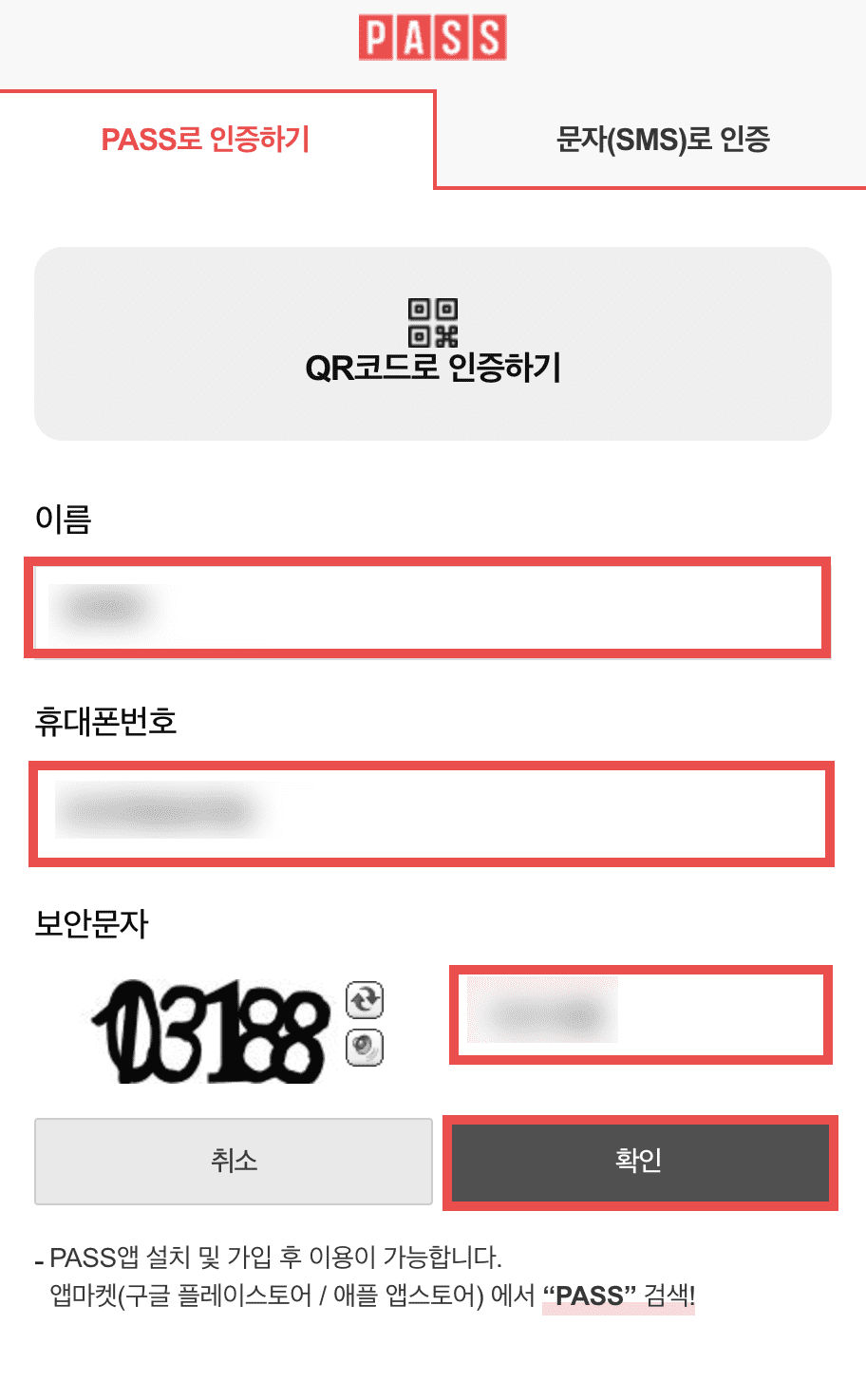 8. [이름] + [휴대폰번호] + [보안문자] 입력 후 [확인] 클릭
